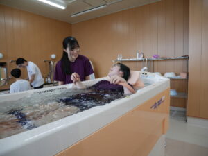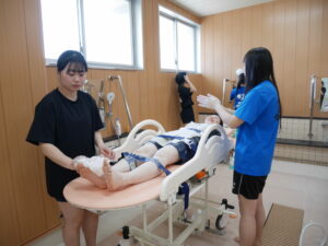 3年福祉科は、5月23日から介護実習がスタートするため、その前に特殊浴槽での入浴実習を体験しました。特殊浴槽の介助体験では、ストレッチャー上での洗身や洗髪を行った後、実際に浴槽に入りました。洗身や洗髪する時の力加減に不安を感じたり、特殊浴槽の操作の仕方に戸惑ったりしながらも、安全に介助することを意識して取り組みました。実際に浴槽に入って「最初は怖いと感じたが気持ちよかった」「利用者の方の気持ちが分かったので実際に介助する時には言葉がけを大切にしたい」という声が聞かれました。今回の学びを活かしていきたいです。