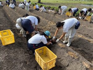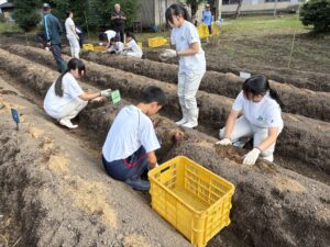 9月30日(火)、3学年農業環境科「作物」選択の生徒が、南砺市立福野中学校の生徒とともにサツマイモの収穫を行いました。