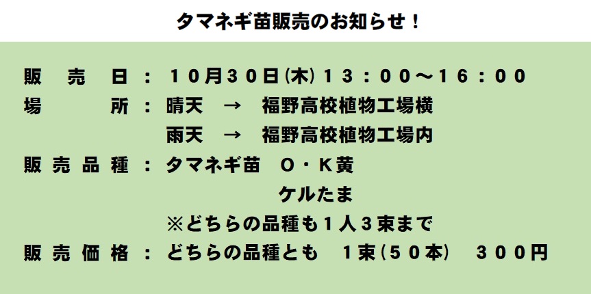【農業環境科】タマネギ苗販売(お知らせ)農業環境科2025年10月22日農業環境科では、恒例のタマネギ苗の販売を実施いたします。農業環境科の生徒が丹精込めて育てた苗です。みなさん、ぜひ、お買い求めください。 なお、苗の数には限りがありますので、売り切れの際は、ご容赦ください。