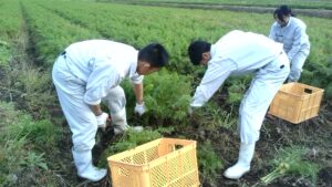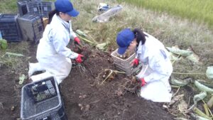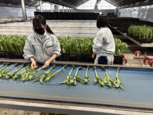 本校で開会式を行い、「株式会社センティア」・「百生屋」・「農事組合法人ファーム八乙女」の3つのグループに別れ、各研修先で研修・実習を行いました。「株式会社センティア」ではチューリップ切花収穫や球根植込み作業、「百生屋」ではサトイモの収穫、「農事組合法人ファーム八乙女」ではサツマイモとニンジンの収穫を行いました。