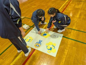 赤、青、黄の3つのチームに分かれ、ボール運びレース、輪投げ、オリジナルミャクミャクを作ろう!で競い合いました。最後に輪になって「マル・マル・モリ・モリ」を踊りました。