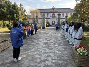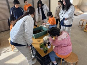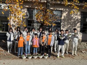 【農業環境科】ふくの少年ハーティクラブとの寄せ植え活動農業環境科2025年11月12日11月8日(土)に、3年農業環境科草花類型の生徒が、福野小学校のふくの少年ハーティクラブに所属している小学生5名と、寄せ植え活動を行いました。生徒は授業で学んだ草花の知識や寄せ植えの技術を、小学生にもわかるように丁寧に説明し、一緒に取り組んでいました。初めはお互い緊張している様子でしたが、寄せ植えを通して徐々に打ち解け、笑顔で会話している姿が見受けられました。 完成した寄せ植えに全員でメッセージを添えて、地域の保育園や交番など9か所に配付し、喜んでいただきました。
