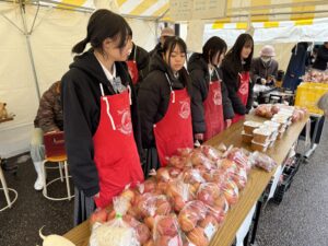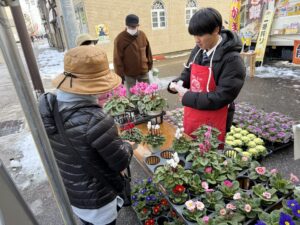 12月27日(土)に開催された「歳の大市」に本校農業クラブ1~3年生の生徒18名が午前と午後のグループに分かれて参加し、南砺福野高校で栽培・加工した農産物を石動証券前で販売しました。ネギや大根、サトイモなどの野菜、ハボタン、シクラメンなどの草花、富有柿やリンゴなどの果樹、富富富のお米、干し柿、りんごジャムや福ふく味噌などの加工品を販売しました。