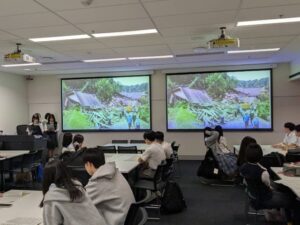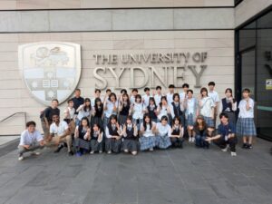 研修2日目はシドニー大学を訪問しました。シドニー大学の現役の学生、大学院生が優しく私たちをエスコートしてくれました。午前中はキャンパスツアーを行い、ランチタイムの後にガイドの学生さんたちと交流する時間がありました。午後にはシドニー大学のAKAGI准教授の前で、半年をかけて準備してきた英語でのプレゼンテーションを行いました。7班の各グループがシドニー大学の教室で大学の先生の前で発表するという、貴重な経験をもつことができました。その後は明日から通う学校にいったん移動し、各ホストファミリーのお迎えを待ちました。不安そうに待っていた生徒たちも、ホストファミリーと顔を合わせると、笑顔で挨拶をして各ステイ先へと別れていきました。