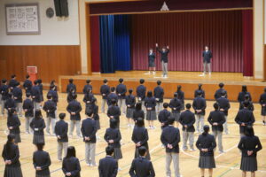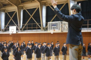この校歌と応援歌は、体育大会や壮行会など、学校生活の様々な場面で歌われます。練習を通して、1年生は本校の一員としての自覚を深め、上級生との絆を強くすることができたと思います。体育大会や壮行会で、1年生が力強く校歌や応援歌を歌い、活躍する姿が見られるのが今から楽しみです。